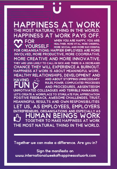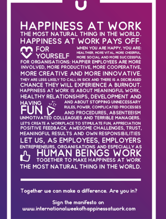 With typical work schedules we spend more days at work than home. So it’s no wonder then that or workplaces can have such an impact on our overall wellbeing. In fact, next week is International happiness at work week. They have a cute little manifesto poster as well!